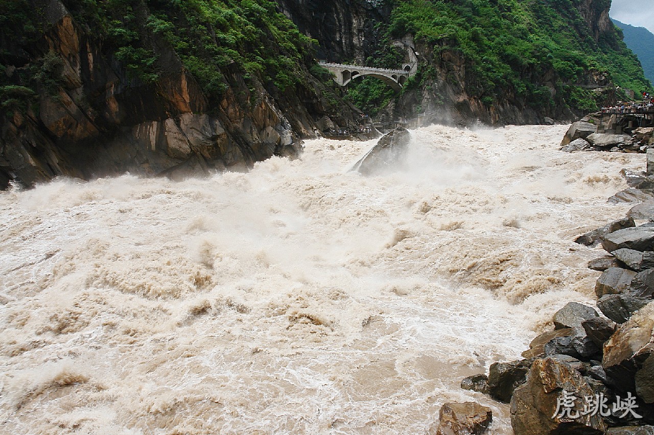 金沙江从石鼓突然急转北流约40公里后,在中甸县桥头镇闯进玉龙雪山和哈巴雪山之间,穿山削岩,劈出了一个世界上最深、最窄、最险的大峡谷——虎跳峡。