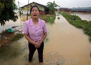 3、洪水冲毁了猪场,,一名养猪的妇女站在水中大哭起来,为自己辛苦的劳动付之东流而痛心。