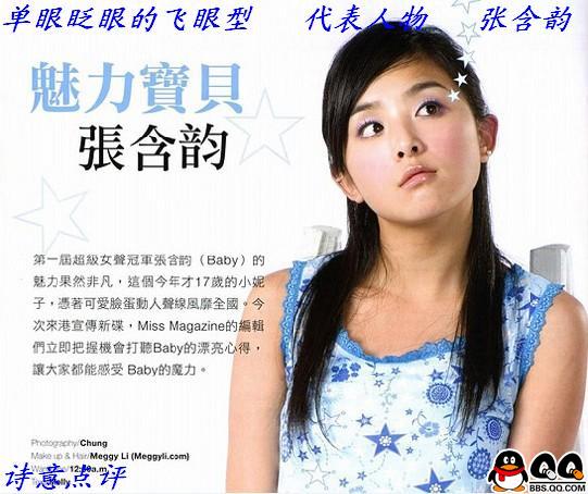 ★单眼眨眼的飞眼型:这种眼神方式是最常见的飞眼方式了,也是非常俏皮的表情。超女张含韵为什么会讨人喜欢,除了她的演唱水平外,这展现她可爱活泼的飞眼无疑是对她最大的帮助,也是少男少女们如此迷恋她的原因