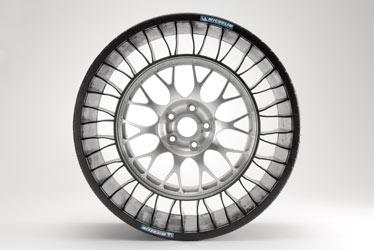 车轮如果没有鼓胀的轮胎,看上去就会很像老式的木轮马车的轮子。但米其林公司(Michelin)研制的Tweel车轮的特点的确具带有返古色彩。它的减震橡胶车轮轮面将压力分散到数十根具有弹性的聚亚安酯车辐上。这些辐条依次由一个铝心轴支撑。因为这种车轮中没有气体,所以它比充气轮胎更坚固,不会出现爆胎的情况。这种车轮已经在“iBOT3000独立机动系统”(iBOT)机器人轮椅和军车上进行了试验。但现在你不会很快在你的轿车上看到这种车轮。米其林公司表示,这种车轮产生的噪音仍旧太大,现在尚不适合应用于汽车上。