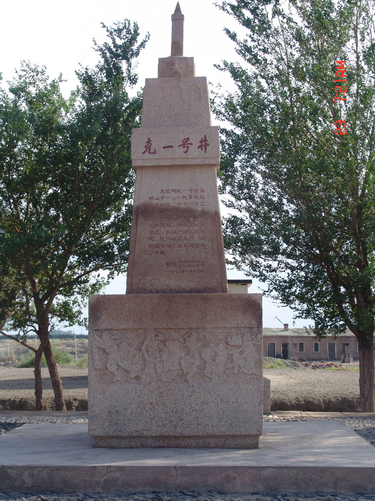 克一号井位于克拉玛依飞机场南面。新中国诞生后,钻机的隆隆声唤醒了沉睡千万年的黑油山,揭开了黑油山神秘的面纱,使埋藏在地下深处的石油源源流出为人民造福。1951年到1955年国家曾多次派出地质调查队到黑油山进行地质考查。1955年6月16日由独山子1219青年钻井队来到黑油山,在现在的飞机场前面定出一号井位。同年7月6日开钻,10月29日完钻喷出工业性油流,是克拉玛依油田发现的标志,现仍在生产。因它是克拉玛依油田第一口井,故定名为“克一号井”,并于1982年10月在此立碑纪念。