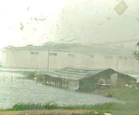 龙卷风飞速移动,揭起厂房的屋顶