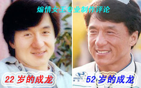 成龙:全中国上下无人不知,无人不晓的大牌动作武打明星了,成龙不仅在国内有如此大的知名度,就连外国,也对成龙的武艺超群高举大拇指。哎,可惜岁月仍对如此优秀的明星无情啊,23岁的成龙与53岁的成龙对比一下,确实老了很多,满面沧桑啊,不知道成龙还能在观众面前闪亮多久?