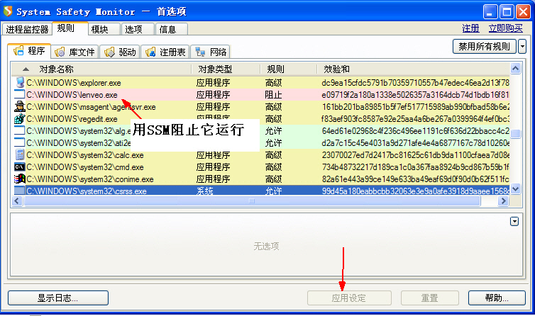 1、在SSM的规则中禁止lenveo.exe加载(图3)。
