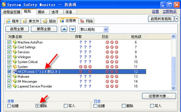 SSM并非监控整个注册表。比如,你想让SSM监控HKEY_CLASS_ROOT\CLSID,当删除CLSID中的任意一个键值时,SSM提示用户。那么你可以自己添加一条这样的规则(图)。