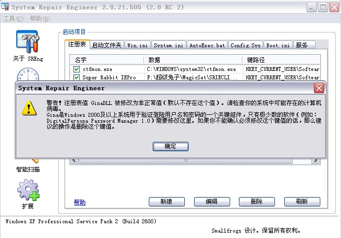 我用sreng2的时候按启动项目有一个提示说注册名:GinaDLL的注册值被改为非正常值,说你的系统可能有病毒,到底有没有,请教高手下,急啊~!
