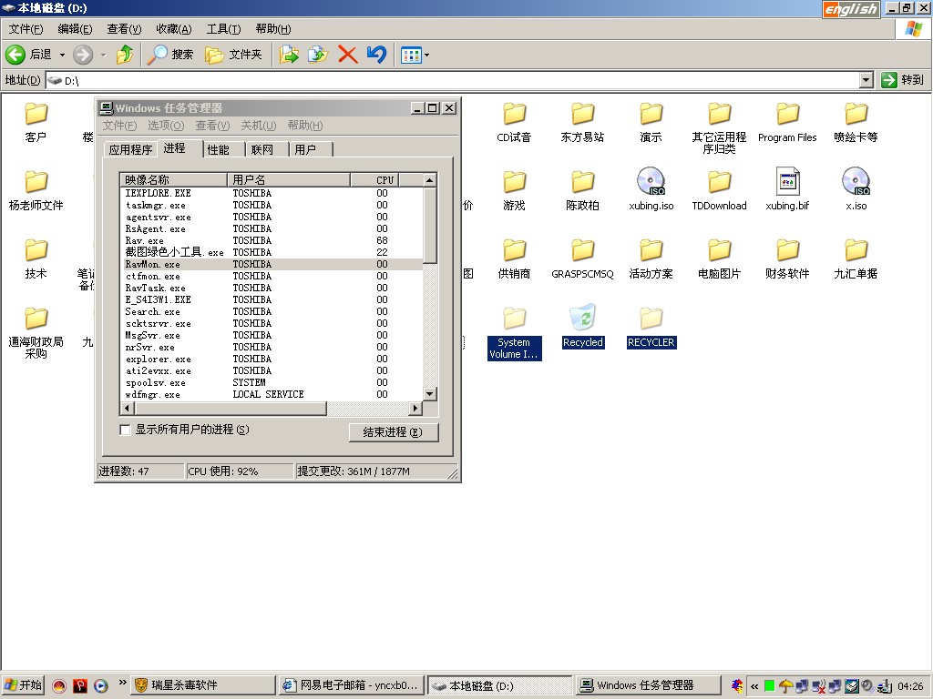 一个USB-U盘给我带来了一个RAVMON.EXE病毒,用07杀了,是个间谍USB病毒,但还在进程内运行,结束不了,在注册表内也没找到RUN] C:文件,现在连个文件打开的速度都要6秒多,真受不了,有谁帮清一下,谢谢,