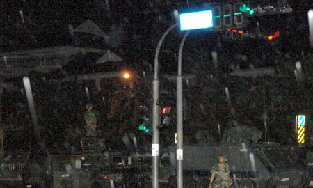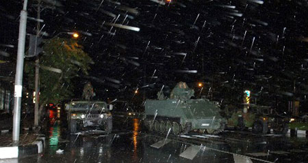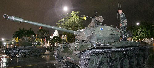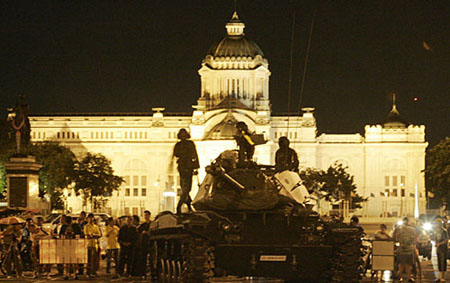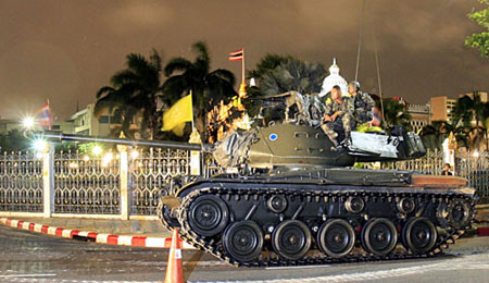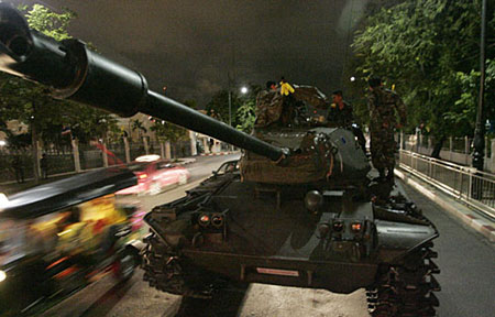 9月19日,泰国军方坦克进驻总理府。泰国军方当日宣布,首都曼谷已被军队和警方控制,总理府也在军方的控制中。泰国军警的行动没有遇到任何抵抗。