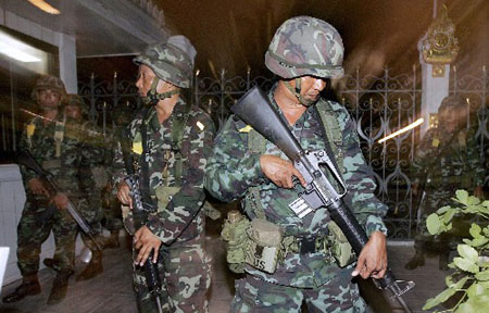 月19日,泰国士兵在首都曼谷总理府戒备。