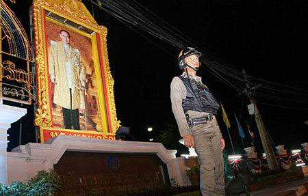 9月20日,一名泰国士兵在泰南部也拉府泰国国王普密蓬·阿杜德的像前站岗