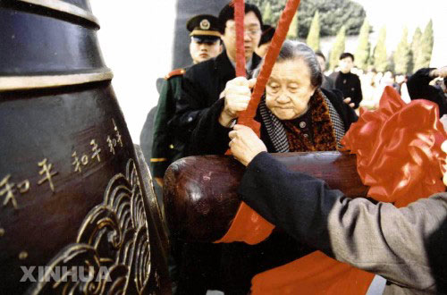 南京大屠杀幸存者李秀英在南京敲响“和平大钟”。