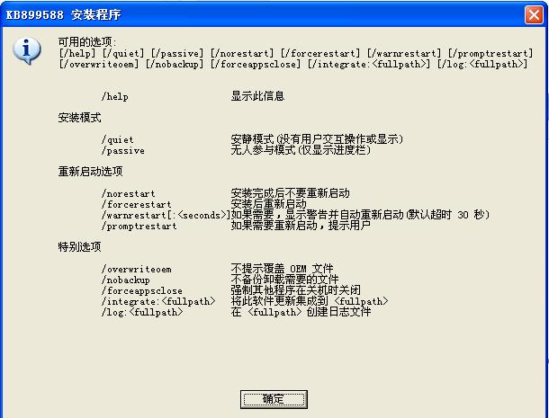 如果在命令提示符下打入WindowsXP-KB899588-x86-CHS.exe/help将显示如下图1所示的帮助信息