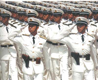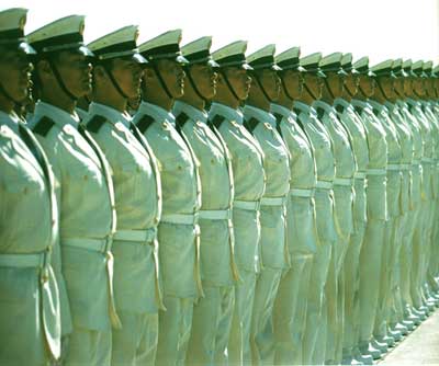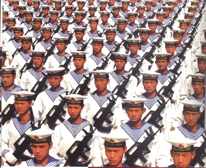 看,在金水桥畔的这一白色方阵,352个红星在一条线上熠熠生辉,352张英气勃勃的青春笑脸,洋溢着神圣与骄傲。这神圣出自不平凡的使命,祖国把300万平方公里蓝色国土和18000公里的海岸线交给他们来守卫,他们50年来不辱使命,经受了战火的洗礼和和平树下的考验。在同国内外敌对势力进行的千余次作战中,涌现出安业民、麦贤得、胡业桃、龚允冲、柏耀平等战斗英雄和忠诚卫士,今天,年轻的水兵们继往开来,做浪中勇士,做深海蛟龙,他们每时每刻都在了望着大海的风云,与军事革命潮起潮涌。