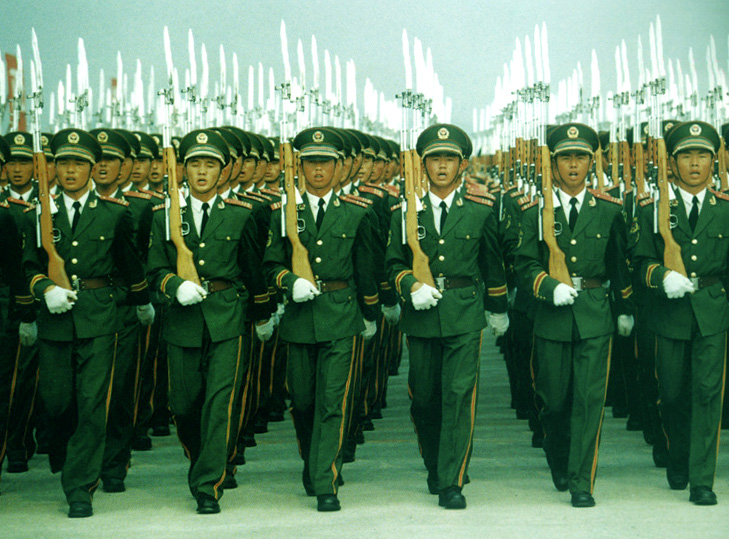 一九四九年开国大典阅兵,受阅部队以海军两大排为前导;接着是步兵师、炮兵师、战车师、骑兵师,共一万六千四百人,由东向西行进。空军十七架飞机从天安门上空飞行受阅,其中有四架是携弹飞行。