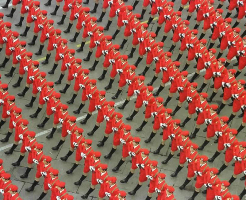 “万绿丛中一点红”。女民兵在受阅的徒步方队里,那朝霞般的橘红色,把受阅部队点缀得更加壮丽。