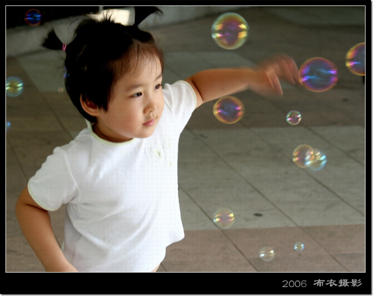 在公园里,看到一个男孩在吹泡泡,一个小女孩追着泡泡灭……很有意思
