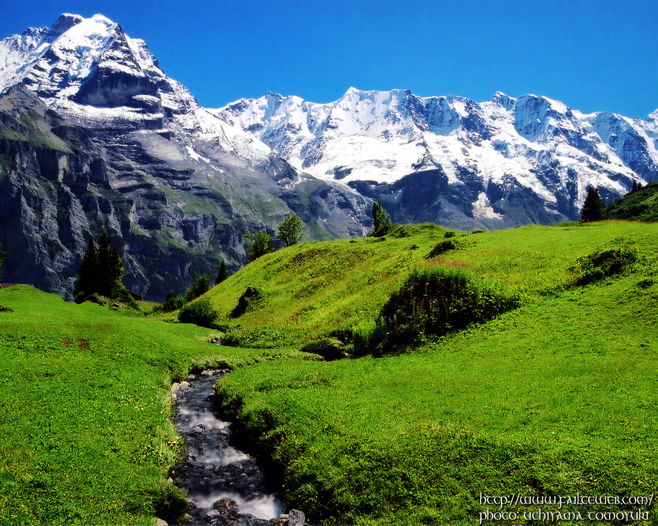 那是欧洲最大、最雄伟的山脉。绵延不绝的山峦顶着白色的山尖,在阳光下闪着金光。目光收回,脚边是芳草碧连天的丘陵和无边无际的繁花。田垄、树林、山岗仿佛在练着瑜珈,个个将身子延伸得很长;不知名的小湖、小河,像孩子眼角挂着的泪水,透着晴空般的蓝,荡漾着雪山的影子;芦苇草、蒲公英等各色野花舒舒坦坦、整整齐齐地围着明镜般的湖面。