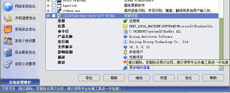 Windows 优化大师提示 RavExt.dll 是文件可疑,建议删除。