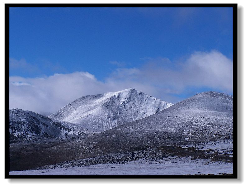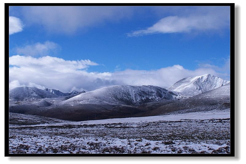 10月2日,离开稻城,返回香格里拉(中甸).早起发现一夜飞雪染白了高山.一路过来,雨雪晴都经历了,最后又见到双虹垂云,真是幸何如哉
