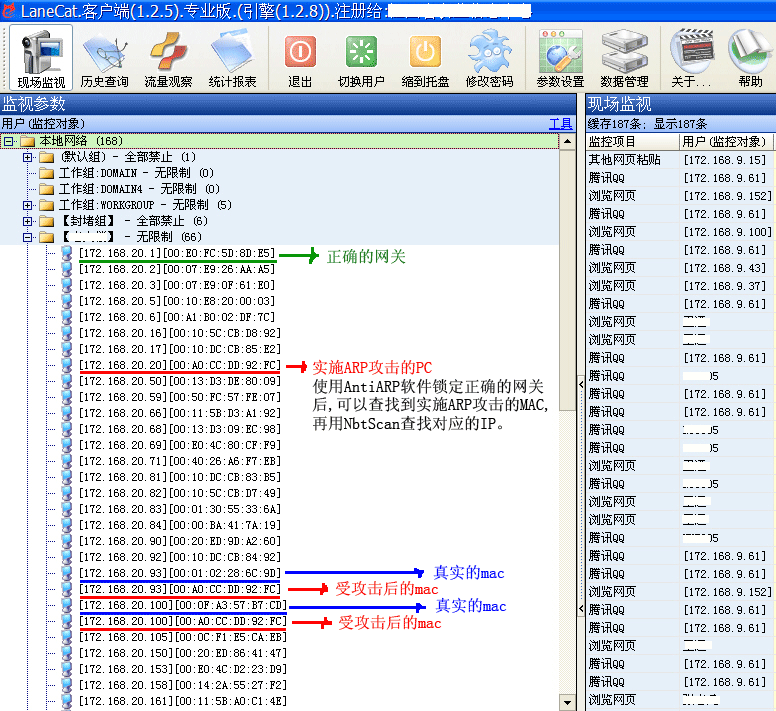 安装LaneCat网猫,通过LaneCat网猫可以看到同1个IP出现2次重复的,但mac地址不同,其中1个mac是正确的,另1个mac地址就是arp攻击者的mac,如果这种现象出现在多台机器的时候,而且多个IP出现的MAC地址是一样的,并且又出现经常断网,那么就可以肯定该网段一定有arp攻击现象。详情请参照下图: