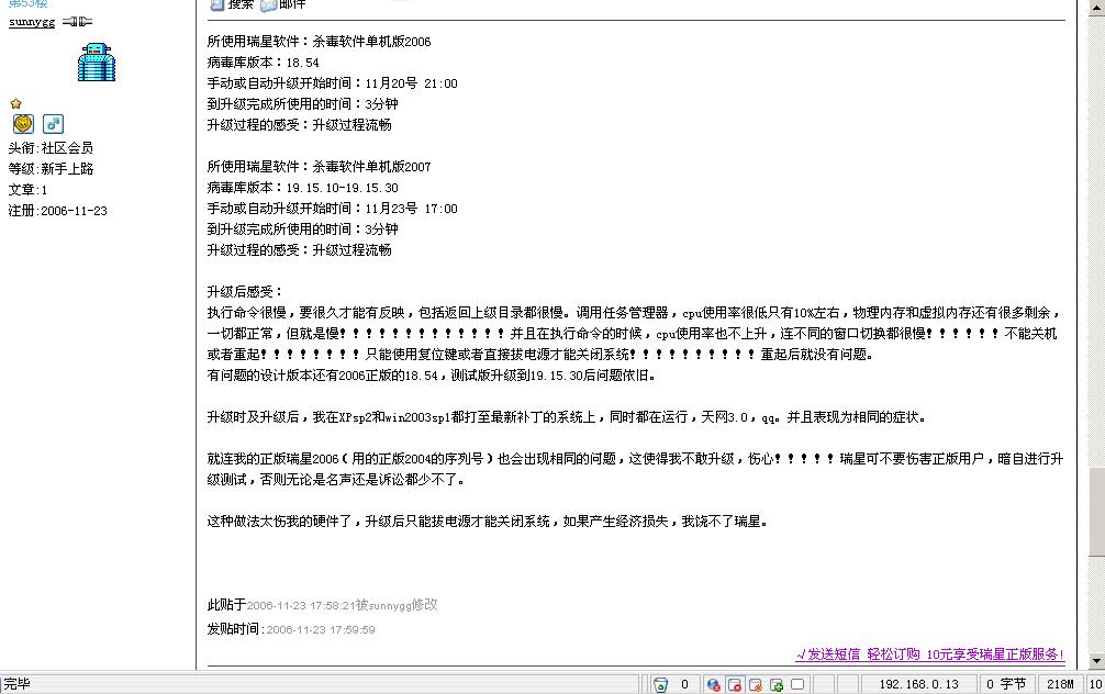 亏我这么信任瑞星,在家用正版,在单位用测试版,怎么对我来讲这个共性问题,始终没有得到解决呢?
