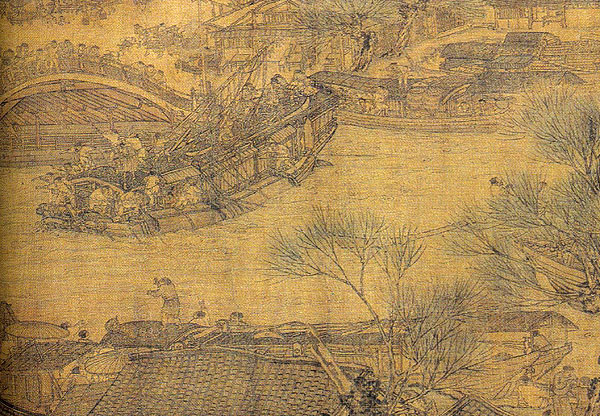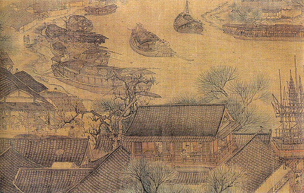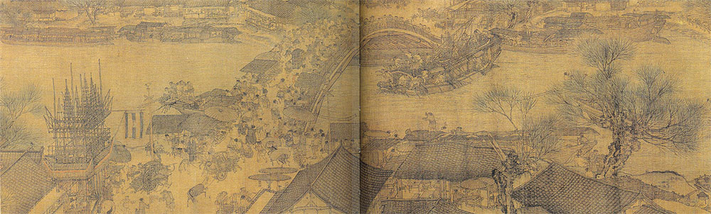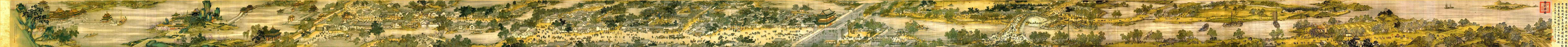 《清明上河图》卷为绢本,水墨淡设色,纵24.8厘米、横528.7厘米,是一幅表现北宋都城汴梁(今河南开封)城市景观的画幅(图一)。现北京故宫博物院藏本的画卷本幅上,并无画家本人的款印,确认其作者为张择端,是根据画幅后面跋文中金代张著的一段题记。张著的题记也仅寥寥数语:"翰林张择端,字正道,东武(今山东诸城)人也。幼读书,游学于京师,后习绘事,本工其界画,尤嗜于舟车市桥郭径,别成家数也。"不过,张择端的姓名并未见于北宋后期成书的《宣和画谱》,有人推测说,可能他进入画院时间较晚,编著者还来不及将其收编书中。