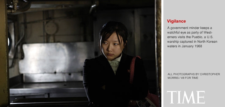 一位政府”观察员”以警觉的眼光审视着每一位来参观PUEBLO(普韦布洛)舰的西方游客, PUEBLO舰是1968年1月被朝方捕获的美国间谍船
