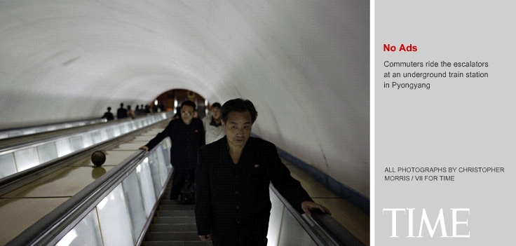 平壤地铁的自动扶梯—整个通道没有一副广告