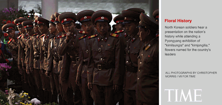 朝鲜的官兵们在参加一个展现民族历史的活动以及一场以”大金” 、”小金”命名的花展
