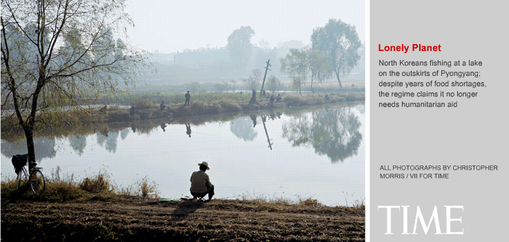 朝鲜百姓在平壤的郊外钓鱼. 尽管连年食品短缺, 但朝鲜当局依然坚持宣称不需要人道主义援助