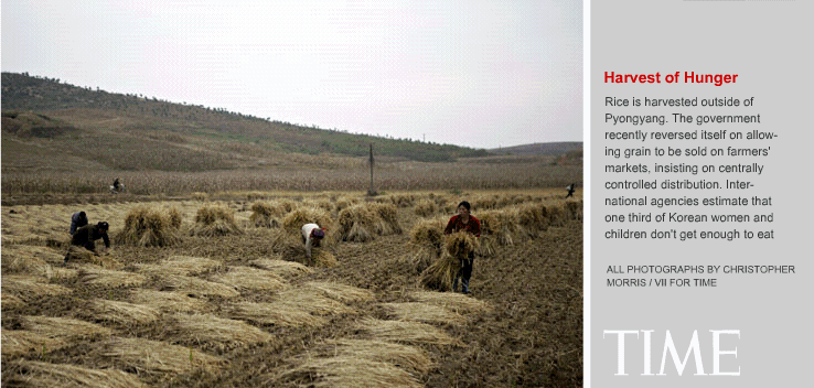 平壤的郊外农民在收割大米. 最近朝鲜政府改变的原来的规定, 允许了在农贸市场上买卖粮食, 但强调必须受控于中央的分配