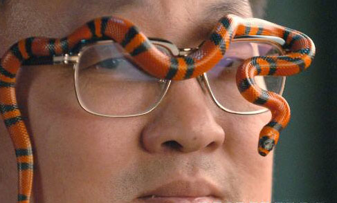 一位天津市民将洪都拉斯牛奶蛇放在自己的眼镜上。