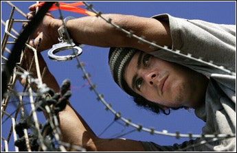 这是2006年全美摄影记者协会推荐的最佳摄影作品之一。照片中一名犹太少年趴在一座犹太教堂的窗户上愤怒地看着以色列警察和士兵冲进位于Neve Dekalim的犹太人定居点。