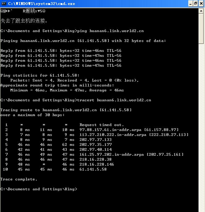ping huanan6.link.world2.cn和tracert huanan6.link.world2.cn和telnet huanan6.link.world2.cn 29000