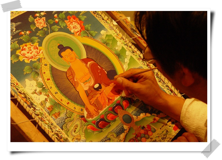 “唐卡”是藏语。“唐”的含意与空间有关,表示广袤无边。画师茨旦朗杰举例说,就像在一块布上,既可画几百甚至上千尊佛,也可只画一尊佛。“卡”有点像魔术,指的是空白被填补。说白了,唐卡,其实也就是西藏的卷轴绘画。