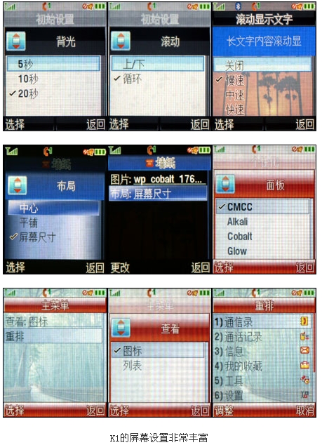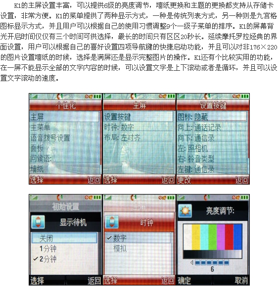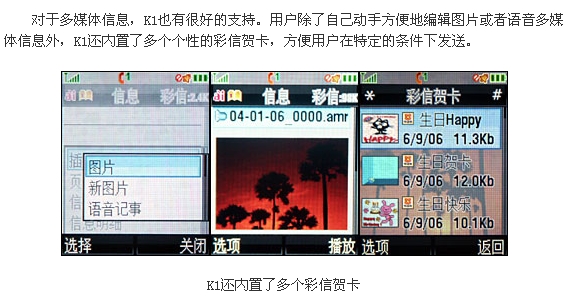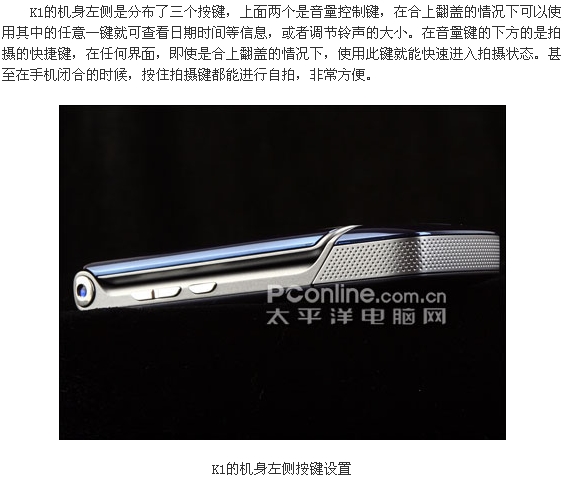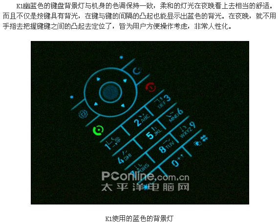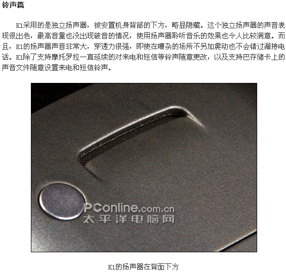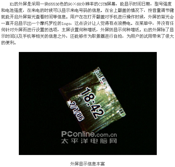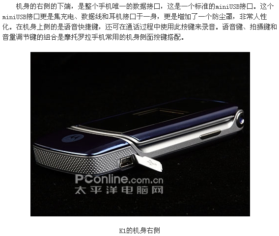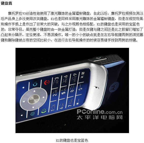 K1延续了V3的超薄特征,在机身细节处理和材质选用上更为出色。作为RAZR系列的接班人,KRZR K1这款代号“金丝雀”的手机外形设计并没有继续追求惊人的超薄机身,而整体确设计十分苗条。整个机身采用了镁和抛光铬材料以及玻璃镜面处理工艺,以宝蓝色质感呈现出一种极其雅致的气质。K1比之V3要窄小很多,厚度是增加了少许,但是操作得手感已经做工等控制得更加成熟。延续了摩托罗拉得经典的操作界面,用过摩托罗拉手机的用户极易上手。200万象素的摄像头,独特的扬声器设计,外放效果极其出色,外屏不仅可以显示常用的信息和时间日期,还可当作取景框进行自拍,非常方便。摩托罗拉公司更是在键盘的手感上下足了功夫,延续了V3以来的激光雕饰镭射键盘,键盘颜色采用与外壳颜色非常搭配的镜湖蓝色,键盘的手感非常优异。内置蓝牙,同时还支持microSD卡进行内存扩展,并可进行可热拔操作。