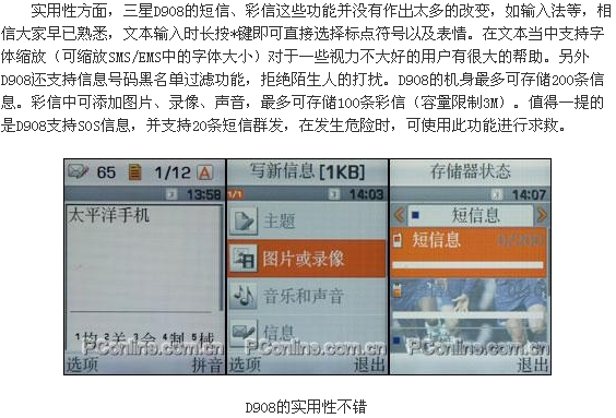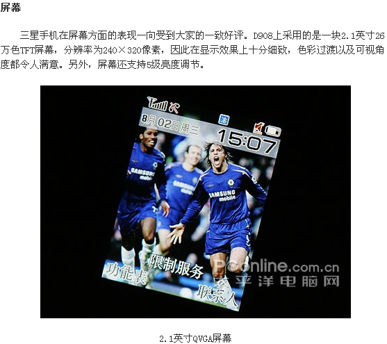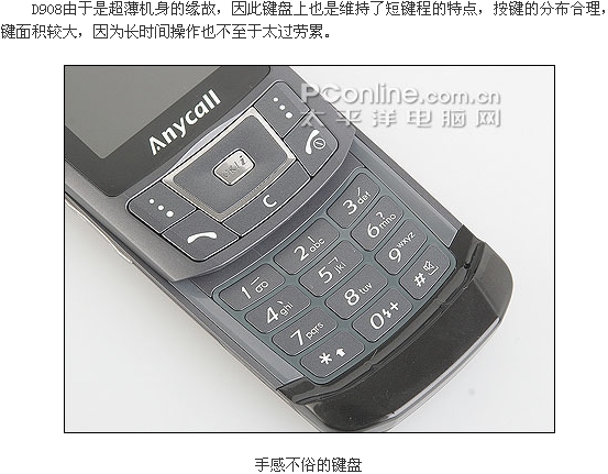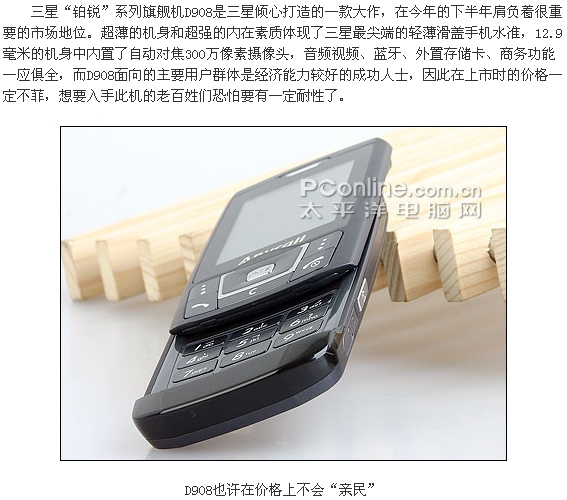 三星D908延续了华铂系列的超薄滑盖造型,从硬件配置上来看,铂锐系列相比华铂系列有较大的升级。D908最早露面于在今年年初的CEBIT展示会上,三星公司便向大家展示了一部只有13mm厚的滑盖手机:SGH-D870,如今三星也将其正式命名为D908推出市场。仅厚12.9mm的D908具备300万像素自动对焦的摄像头,精湛新颖超乎寻常的屏幕显示,尊贵、高尚、典雅的设计马上吸引着众多的目光。下面就请大家一起来欣赏这台“铂锐”旗舰新机——D908的抢先详细评测。