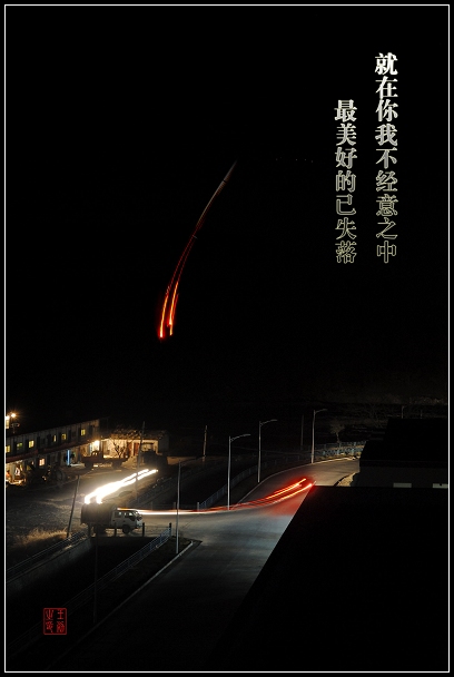 但是其效果并没有达到我想要的效果,脑海里想象的是浩瀚的夜空中有些星星在闪烁,远远的地方,是一座亮着灯的小屋,四周的山隐隐可见,可是这样的场景一时无法找到,所以没能很好地表达其意境。