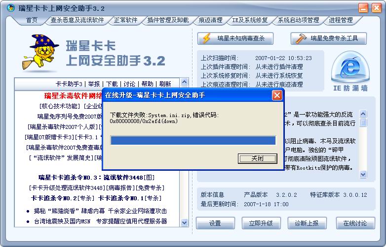 瑞星卡卡版本号是3.2.0.2,无法升级了,重新安装也不行。具体大家看图片吧。谢谢!