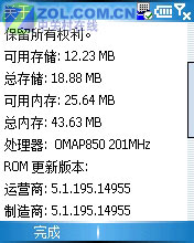 一直按动方向键的下,我们便能够看到如下的内容:18.88+43.63MB的内存组合方式。而在这些空间当中,实际用户可存储内存空间为12.23MB,而程序可调用的运行内存空间为25.64MB。可以说这样的硬件配置已经绝对可以满足流畅运行Windows Mobile 5.0操作系统Smartphone平台各种应用需求了。
