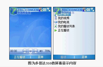 虽然并不是一款以音乐为卖点的手机,但得益于与“微软”公司的亲缘关系,多普达310(资料 文章 价格 评论)这方面的能力还是相当令人期待的,因此我们还是对其进行了评测。小编首先选择了几种常见音乐格式的不同压缩比文件测试该机的兼容性。令人欣喜的是,该机可以识别并播放包括56kbps、128kbps、160kbps、192kbps、256kbps和320kbps在内的以上全部六种比较常见压缩比的MP3音乐文件。
