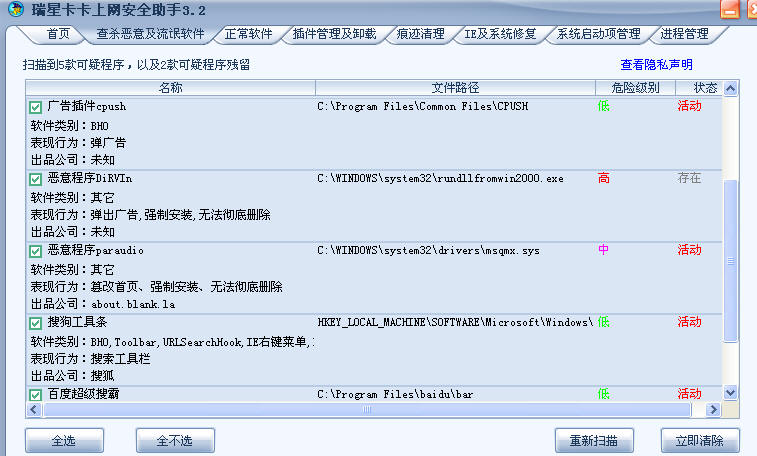 我装了瑞星卡卡发现中了两个恶意程序DiRVIn与paraudio