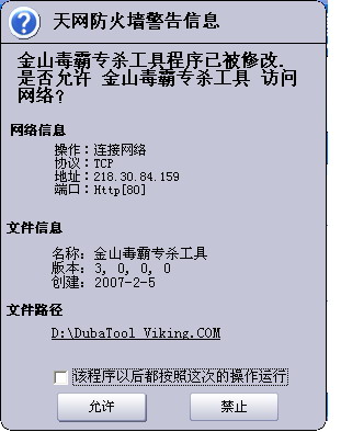 当你在使用某款具有网络功能的应用软件时,例如金山毒霸威金专杀工具,天网防火墙(V3.0以上个人试用版)会给出提示:“金山毒霸专杀工具 程序已被修改,是否允许 金山毒霸专杀工具 访问网络”,此时您千万不能点击“允许”,否则就等于让恶意程序连通网络(可能是木马)。天网防火墙给出的正常提示应该是:“是否允许 金山毒霸专杀工具程序 访问网络”。