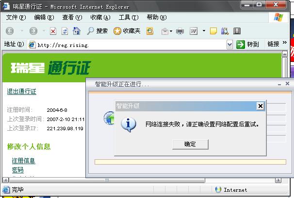 我是瑞星的正版用户,前一段一直能正常升级,这段时间不知道为什么不能升级了