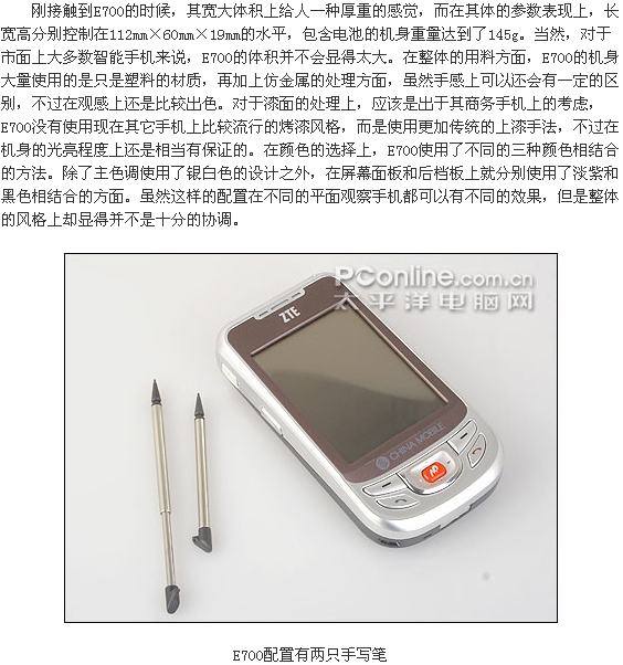 但是今天我们要介绍的中兴E700却是面向GSM市场的产品,而且作为移动定制机型推出。中国移动所选定的定制机型都有严格的规定,国产的智能手机入选也并不多见,从中我们可以看出移动对中兴E700的认同。更重要的是E700还负担起中国移动“QR码识别”和“手机地图”这两个新应用服务的推广。E700是否有能力完成这一使命,也许能从下面的评测文章中找到答案。