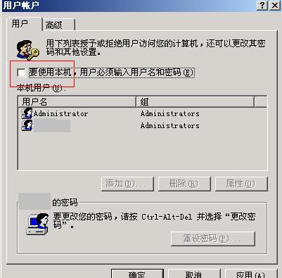 (2)在“用户账户”窗口中取消“要使用本机,用户必须输入用户名和密码”。
