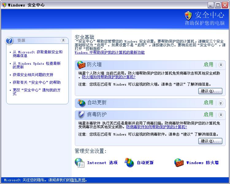 今天开机时Windows提示我计算机存在风险,并说在我的计算机里找不到杀毒软件,但是我的瑞星已经开启并且已经升级到最新版本了,以前一直没提示过我呀!这是怎么回事呢?怎么能让windows找到啊?