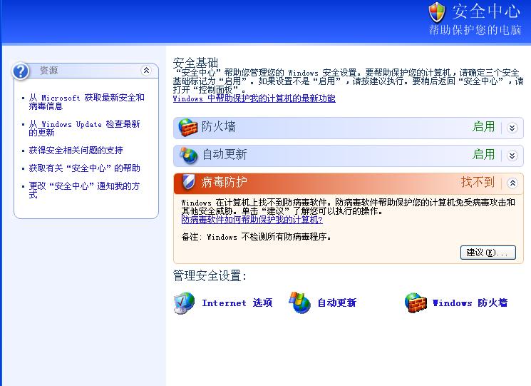 就是这个,以前出现红叉的时候只是提示我杀毒软件过期,但是现在怎么说找不到了呢?我的是正版的瑞星啊!没安别的杀毒软件。请大侠们指点,小妹感激不尽。