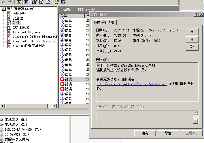 昨天晚上,把系统升级到了SP2,重启之后等了有1分多钟才进入桌面,而且从事件查看器中有3个错误!!!!有方法解决的朋友,帮一下!!!!!