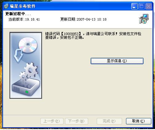 今天在瑞星杀毒升级的时候,出现了报错现象:错误代码(10009953),请与瑞星公司联系!安装包文件检查错误,安装包不正确。